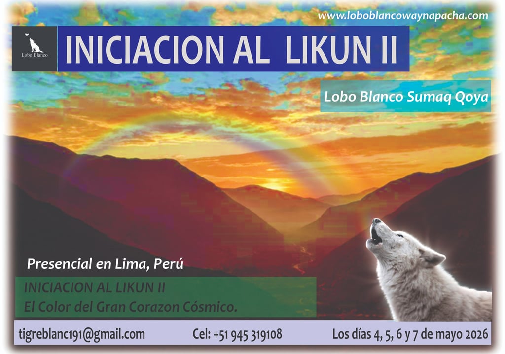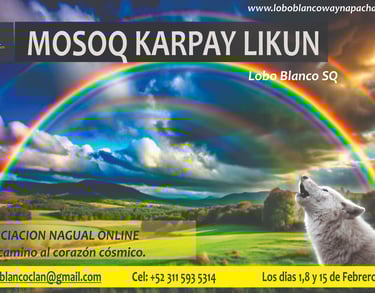 Se le llama la nueva iniciación, MOSOQ KARPAY LIKUN que se dará este año por medios digitales. Esta se llevará a cabo por una serie de 3 charlas por Google meeting los días 1, 8 y 15 de Febrero 2026, donde Lobo Blanco Sumaq Qoya, heredera y portadora de Qamaska con 20 años de experiencia en el camino espiritual, te ira guiando, para que puedas encontrar este único equilibrador perfecto cósmico de tu corazón que puede caminar y moverse en este tiempo, que es llamado Nagual, Espíritu santo, Estrella, Chaska, etc.